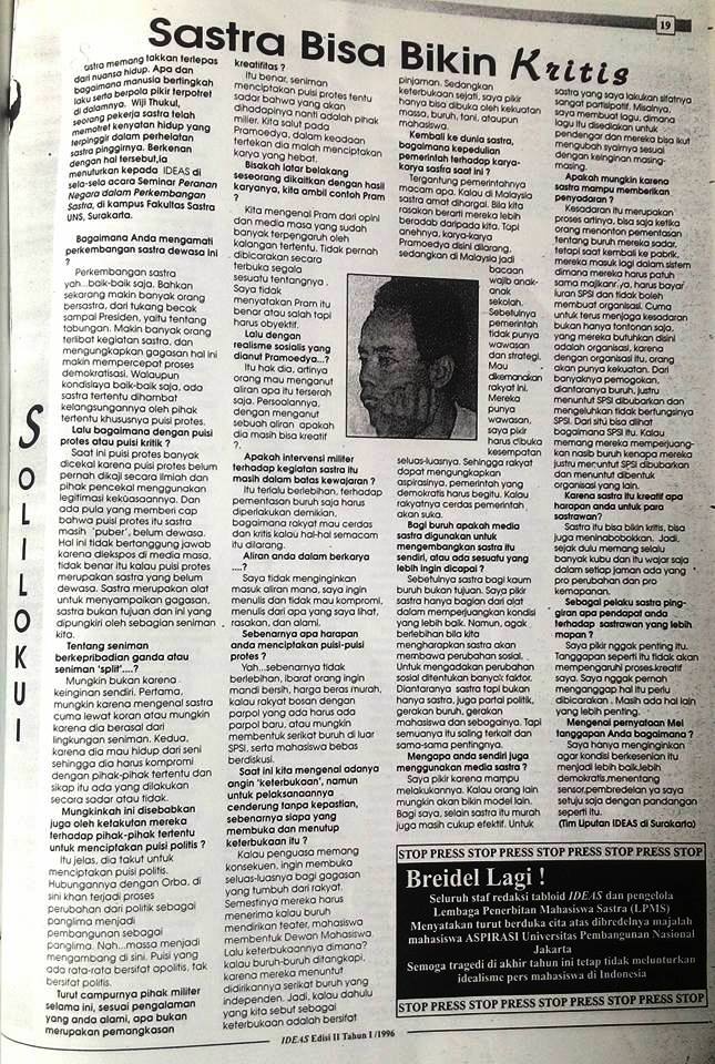 Wawancara dalam Tabloid Ideas diturunkan dalam format tanya jawab berjudul “Sastra Bisa Bikin Kritis”. Isi wawancara menyebutkan, Wiji tak segan mengkritik sikap kritikus puisi atau seniman yang mengatakan puisi protes adalah puisi “puber” atau puisi yang belum dewasa. Wiji dengan tegas mengatakan penilaian itu tidak bertanggung jawab dan tidak benar. Karena bagi Wiji, “Sastra merupakan alat untuk menyampaikan gagasan, sastra bukan tujuan dan ini yang dipungkiri seniman kita”.
