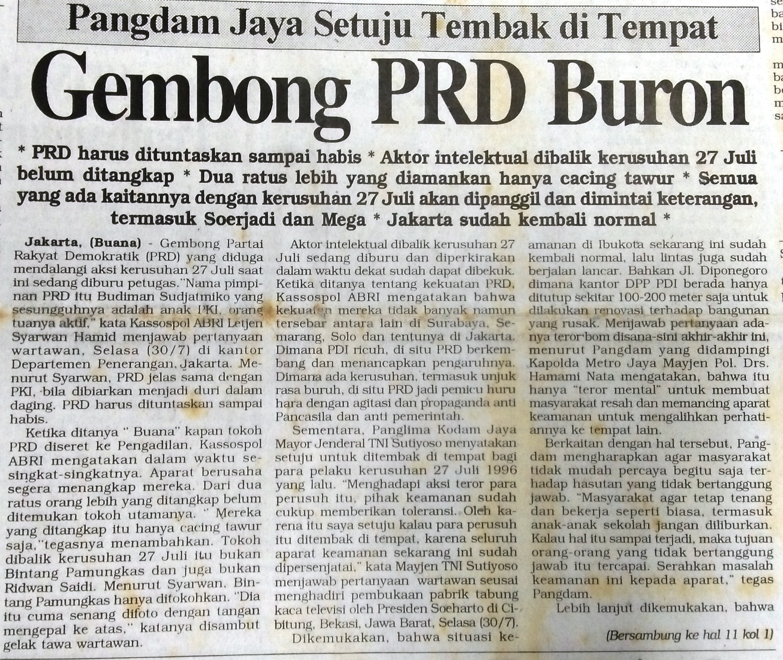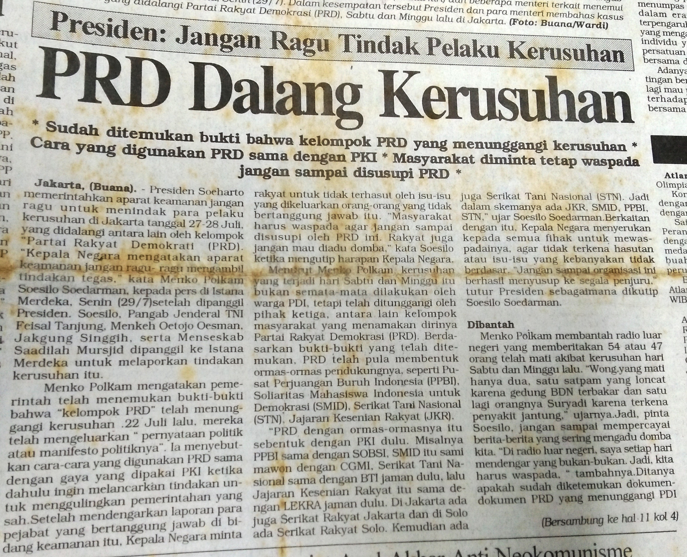 Pemerintah menetapkan , Partai Rakyat Demokratik (PRD) sebagai agitator kerusuhan. “Saat itu yang gencar memberitakan Gatra, Garda, Pos Kota dan Terbit,” kata Wahyu Susilo, adik Wiji Thukul kepada Independen, pekan lalu. Ia mengaku ketika peristiwa itu terjadi, telah bekerja di Jakarta.