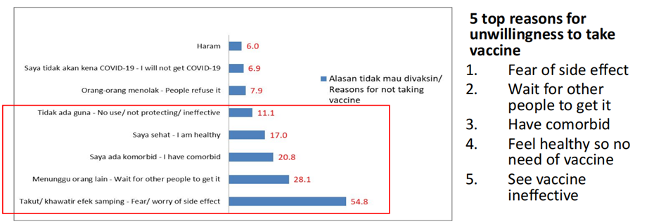 Jika didalami lebih jauh, alasan mereka yang tidak mau divaksin yang paling banyak dikemukakan adalah karena: takut pada efek sampingnya, menunggu orang lain, karena ada komorbid, merasa dirinya sehat, vaksin dianggap tidak efektif. Alasan karena halal/haram justru sangat sedikit dan di peringkat akhir.