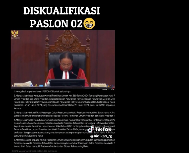 Independen.id -- Sebuah video beredar di akun media sosial Facebook dengan mengklaim bahwa Mahkamah Konstitusi (MK) telah memutuskan untuk mendiskualifikasi pasangan calon presiden-calon wakil presiden nomor urut 2, Prabowo Subianto-Gibran Rakabuming Raka.