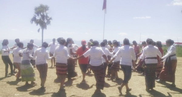 Menari bersama dilakukan anggota Sekolah Perempuan dan Kelompok Belajar Komunitas Kota Kupang, usai upacara, Kamis (17/8).