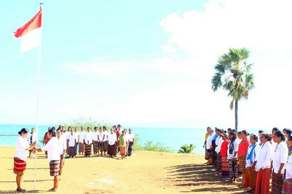 Mengenakan kain tradisional Kupang, pengibaran bendera dilakukan anggota Sekolah Perempuan. Usai upacara, mereka pun menari bersama dan menggelar lomba.