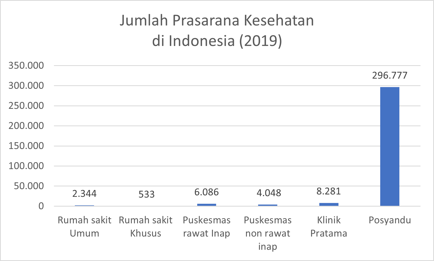 Dikutip dari Statistik Indonesia 2020 yang dikeluarkan oleh Badan Pusat Statistik (BPS), hingga tahun 2019 Indonesia memiliki dokter sebanyak 81.011 dan perawat sebanyak 345.508. Sedangkan untuk Rumah Sakit Umum sebanyak 2.344, Rumah Sakit Khusus sebanyak 533, Puskesmas rawat inap sebanyak 6.086, Puskesmas non rawat inap sebanyak 4.048, Klinik Pratama 8.281, dan Posyandu 296.777. Saat ini jumlah penduduk Indonesia berjumlah sekitar 271 juta.
