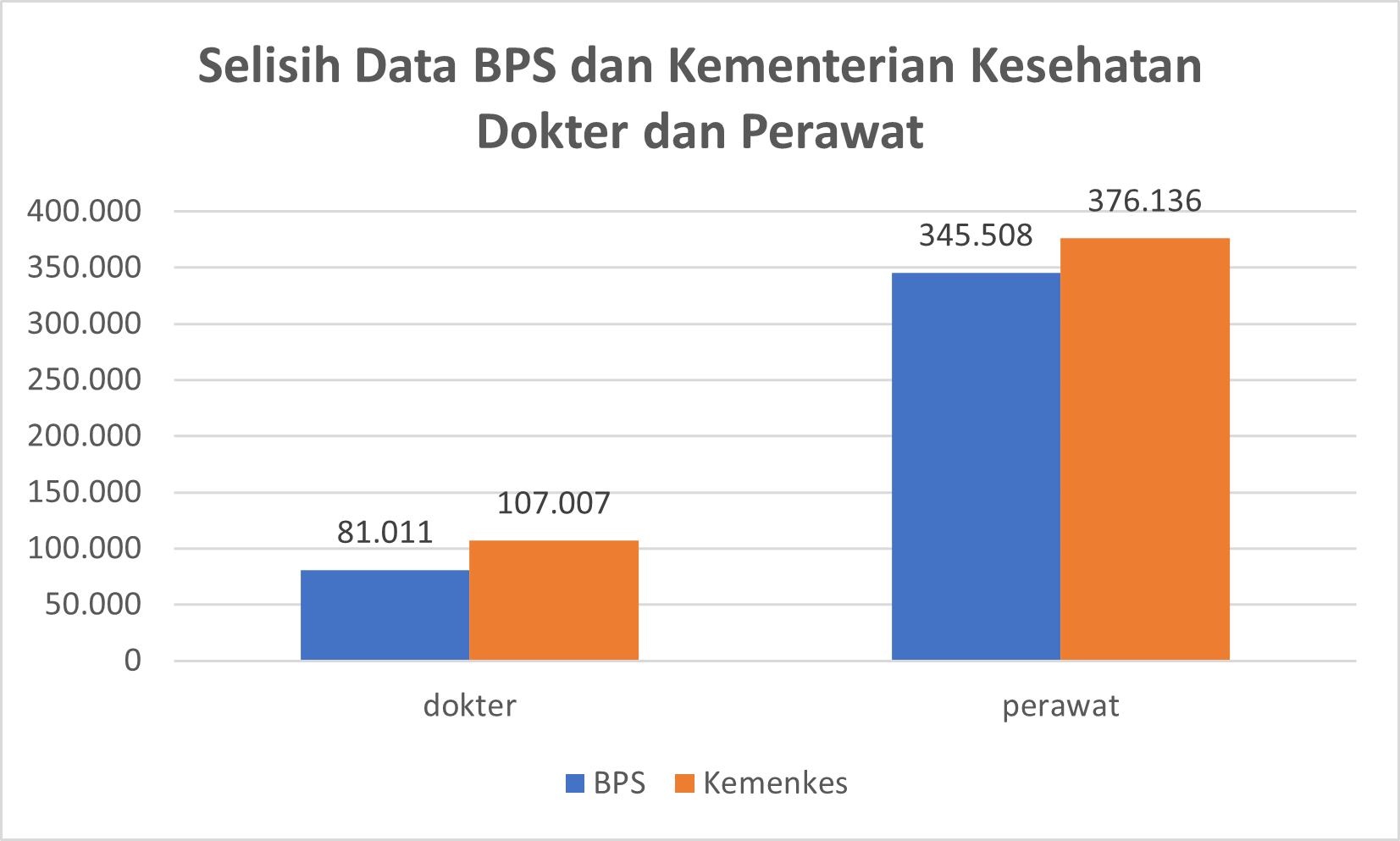 Namun data yang dirilis oleh Badan Pusat Statistilk (BPS) memang berbeda dengan data Kementerian Kesehatan. Dikutip dari bppsdmk.kemkes.go.id, menurut catatan Badan Pengembangan dan Pemberdayaan Sumber Daya Manusia Kesehatan (BPPSDMK) Kementerian Kesehatan, hingga 31 Januari 2019, tenaga medis di negeri ini berjumlah 107.007 dan tenaga keperawatan berjumlah 376.136.