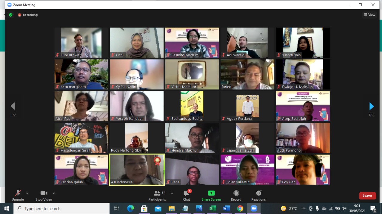 Independen --- Di masa Pandemi Covid-19 yang masih terus menginfeksi banyak orang Indonesia, maka kegiatan daring menjadi pilihan aman dan rasional dalam situasi saat ini. Oleh karena itu AJI Indonesia membuat terobosan dengan menyiapkan Uji Kompetensi Jurnalis berbasis digital. Kegiatan yang diberi judul orientasi Uji Kompetensi Jurnalis (UKJ) berbasis digital diselenggarakan selama tiga hari mulai 30 Juni hingga 3 Juli 2021 melalui daring.