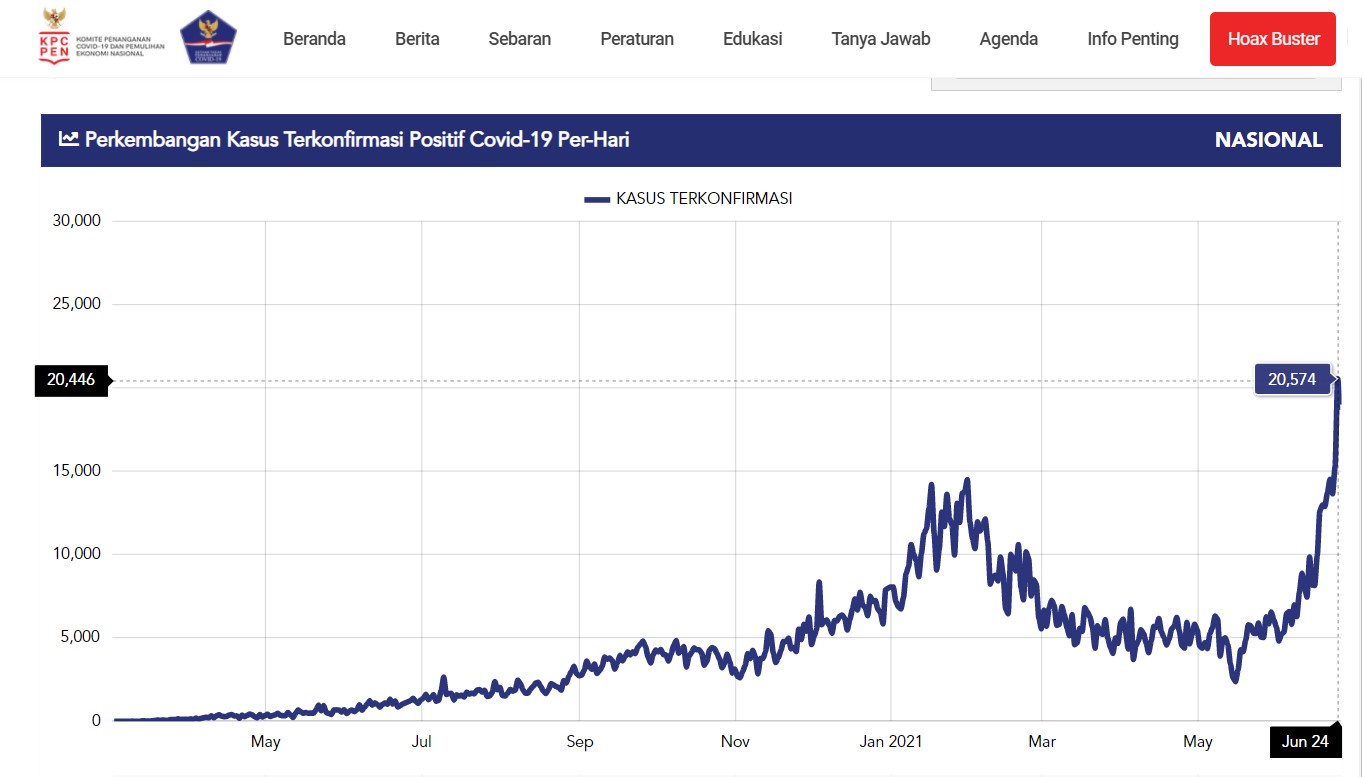 Independen – Beberapa hari terakhir ini terjadi lonjakan jumlah orang terinfeksi Covid-19. Pada tanggal 24 Juni 2021, tercatat lebih 20 ribu orang terinfeksi Covid-19. Ini angka tertinggi selama Pandemi Covid-19 di Indonesia.  Angka terakhir kemarin (25/6) mereka yang terinfeksi Covid-19 bertambah 18 ribu lebih dalam sehari. Sementara itu Rumah Sakit banyak yang menolak pasien, seperti yang dilaporkan oleh LaporCovid-19 dalam rilisnya (26/6).