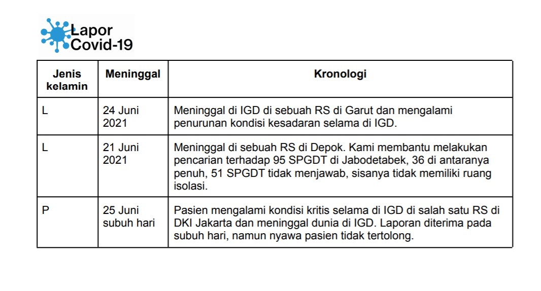 Relawan-relawan LaporCovid-19 yang juga membantu masyarakat untuk mencari rumah sakit, menceritakan salah satu pasien yang akhirnya tidak tertolong. Seorang laki-laki berusia 59 tahun yang tengah berada di salah satu rumah sakit di Depok dan memerlukan ICU dengan ventilator. Pada Sabtu malam (19/6) hingga Minggu dini hari relawan LaporCovdi-19 berusaha mengontak 95 SPGDT (Sistem Penanganan Gawat Darurat Terpadu) yang berada di Jabodetabek, hingga Minggu (20/6) menjelang dini hari.