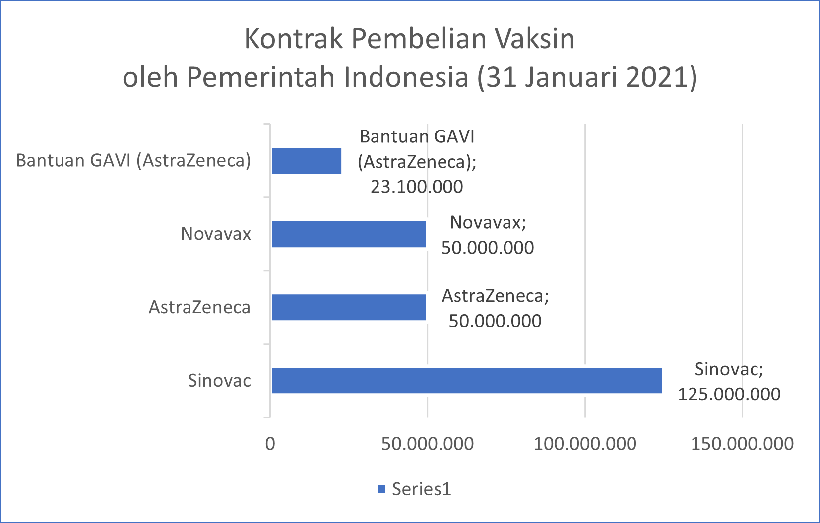 Dari beberapa upaya tersebut, telah diperoleh sejumlah komitmen jumlah dosis yang bisa diberikan untuk Indonesia. Kerjasama dengan Sinovac, Indonesia akan memperoleh 125 juta vaksin. Kemudian dengan AstraZaneca dan Novavax sudah ditandatangani kontrak masing-masing 50 juta dosis vaksin. Lewat skema GAVI, akhir Januari lalu, Indonesia mendapat komitmen 13,7 sampai 23,1 juta dosis vaksin AstraZaneca. Total vaksin yang sudah ditandatangani kontrak adalah 248,1 juta dosis. Ini masih jauh dari target pemerintah yaitu setidaknya 400 juta dosis untuk target vaksinasi 181,5 juta penduduk Indonesia. Namun Menteri Kesehatan Budi G. Sadikin optimis dapat mengamankan sekitar 660 juta dosis vaksin dari berbagai sumber.