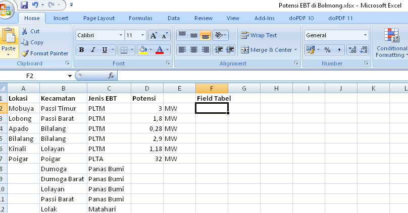 Setelah layer peta dasarnya jadi sesuai yang diinginkan, kemudian layer pertama diduplikasi menjadi layer kedua. Lalu tambahkan satu kolom dengan mengedit attribute table, untuk memasukan besaran potensi EBT di kecamatan yang terpilih.