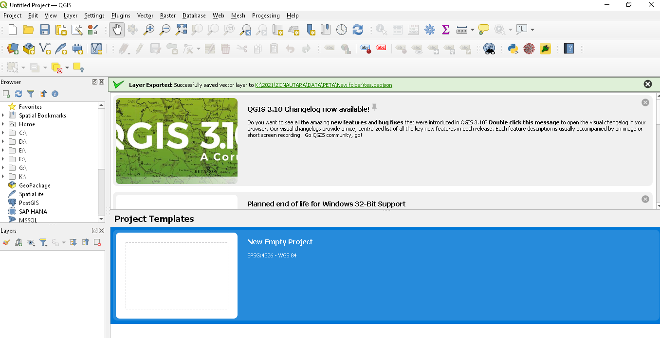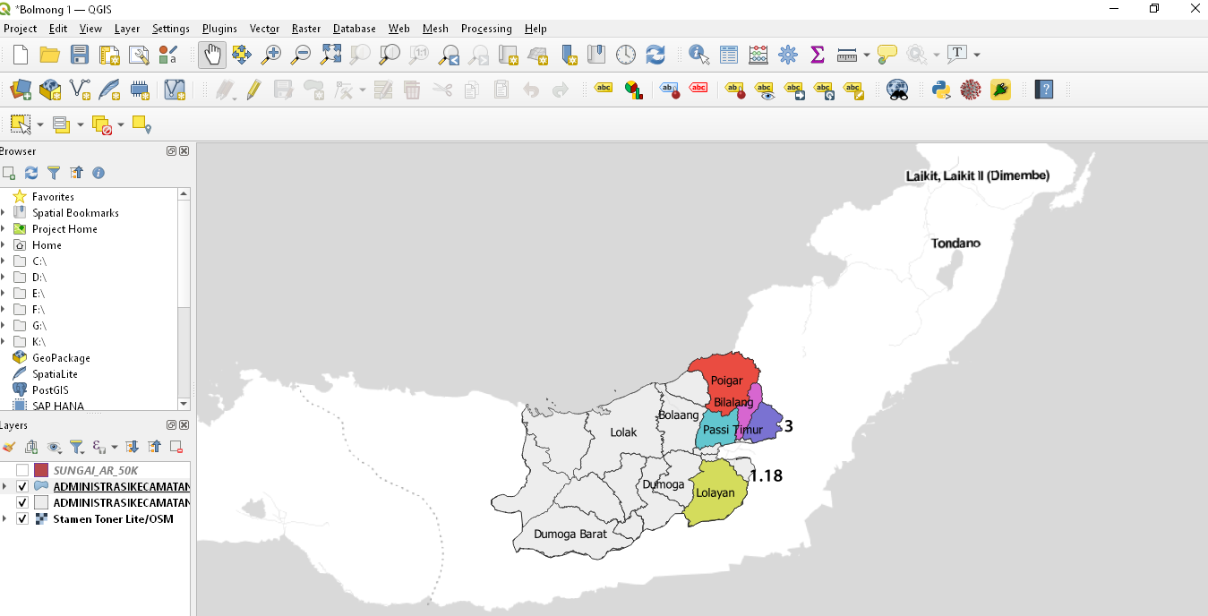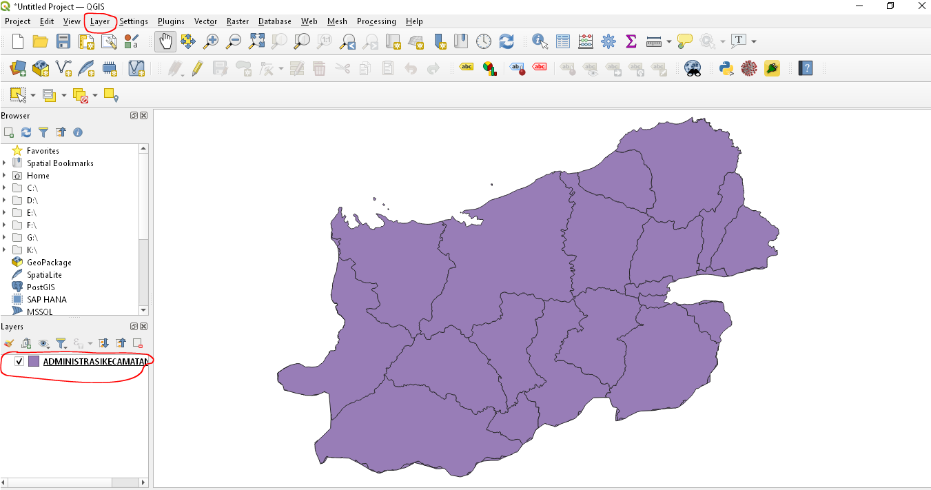 Setelah file shape kabupaten Bolmong didapatkan, langkah berikutnya adalah menyisip file tersebut ke layer di QGIS. Buat project baru, lalu tambahkan layernya.