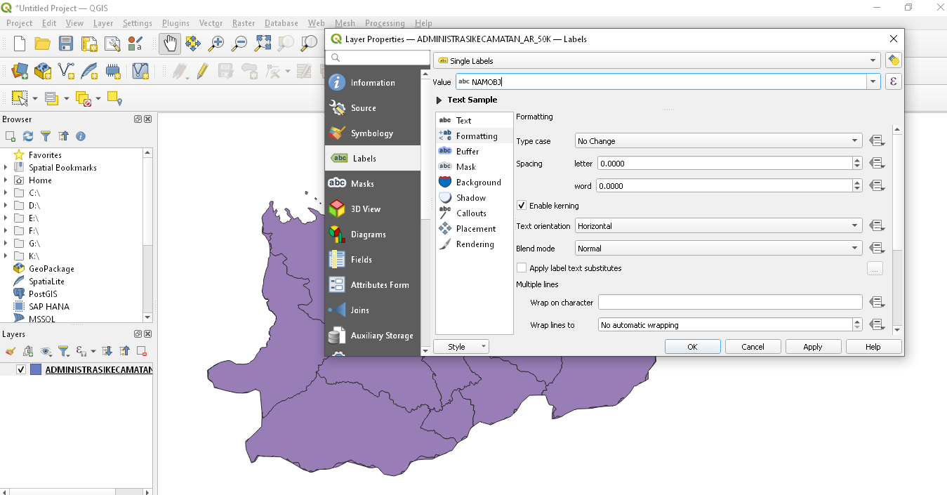Layer peta wilayah Kabupaten Bolmong ini kemudian diatur sesuai dengan keperluan. Silahkan klik kanan di bagian nama layer, lalu pilih properties. Banyak hal yang dapat dilakukan di sini, seperti mengubah warna peta, dan menampilkan label.