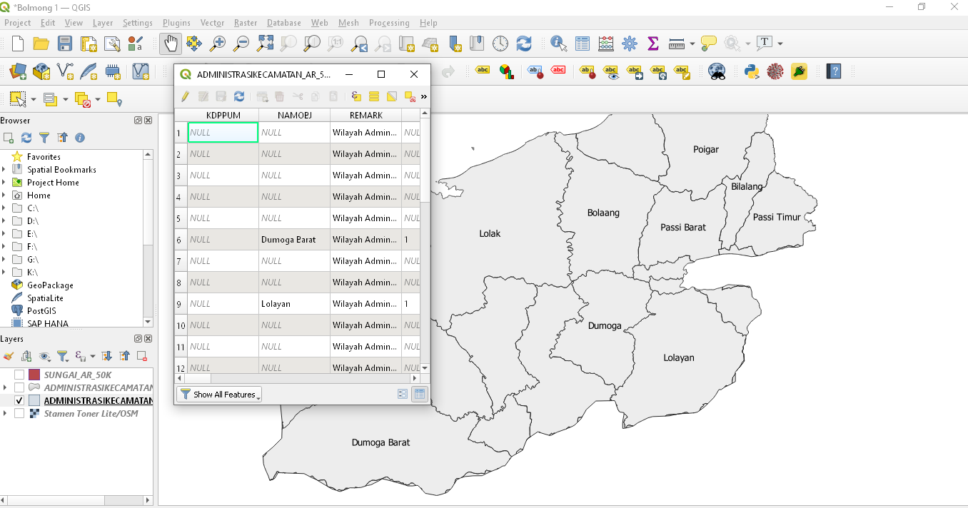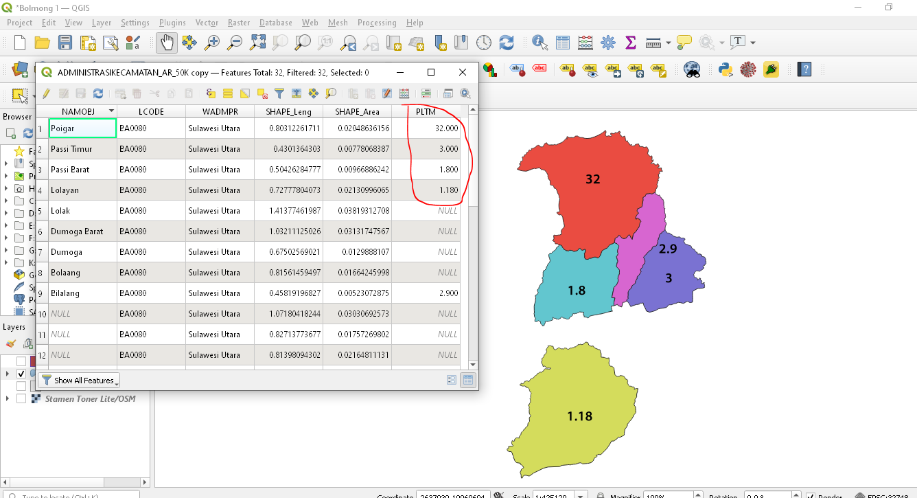 Tidak semua kecamatan di Bolmong punya potensi EBT, sehingga perlu dilakukan modifikasi pada attribute table, dengan mengklik kanan layer, lalu menghapus data kecamatan yang tidak perlu ditampilkan.