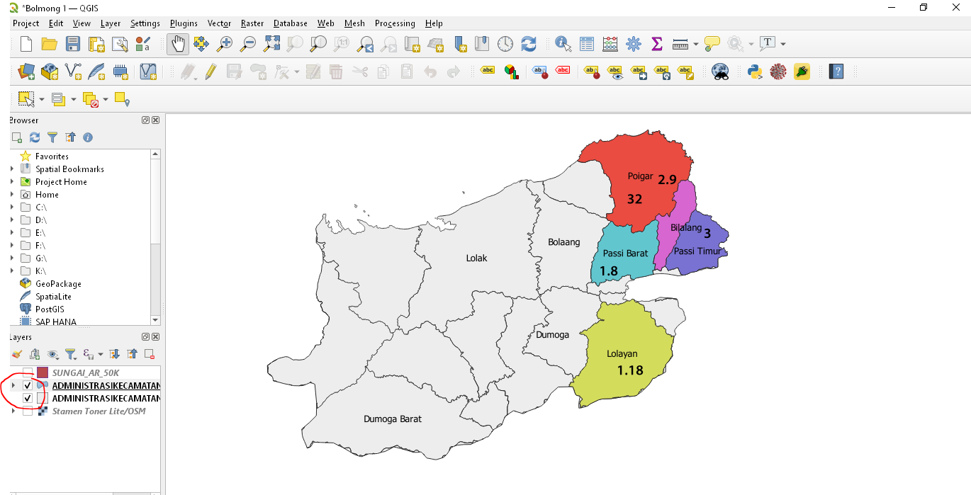 Setelah layer kedua di custom, dengan menampilkan label dan mewarnainya. Kedua layer kemudian ditampilkan.