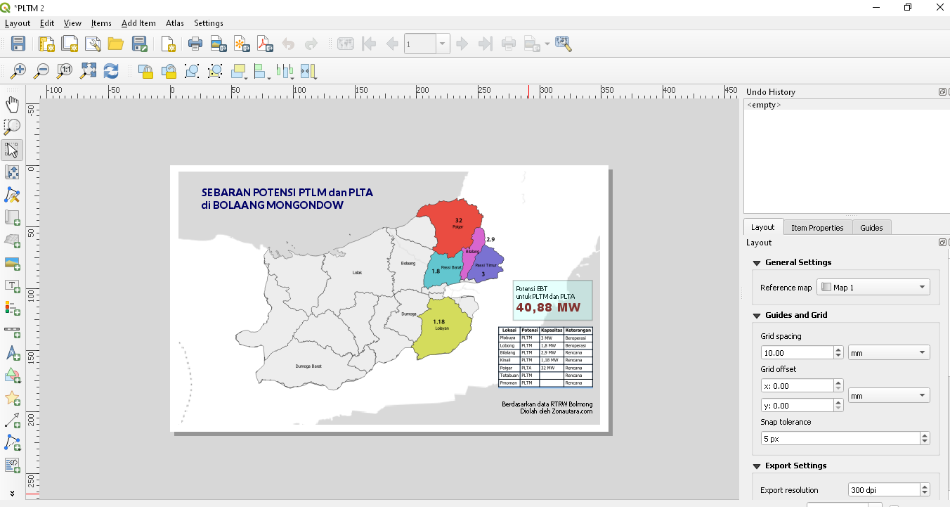 Langkah terakhir adalah mengekspor peta ini ke file jpeg, agar bisa disisip di dalam laporan liputan dengan menggunakan tools print layout. Tujuannya agar bisa menyesuaikan ukurannya, dan juga menyisipkan beberapa informasi tambahan seperti judul, tabel dan informasi total potensi EBT di Bolmong.