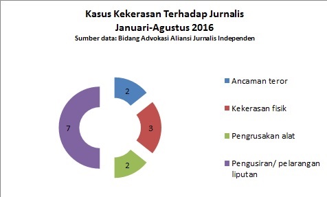 Data kekerasan Bidang Advokasi Aliansi Jurnalis Independen (AJI) Indonesia menunjukkan, tahun lalu terdapat 42 kasus kekerasan yang diterima jurnalis. Bentuknya beragam mulai dari ancaman teror, kekerasan fisik, pembunuhan, pemidanaan, hingga pengrusakan alat. Tahun ini, hingga bulan Agustus, AJI mencatat ada 14 kasus.